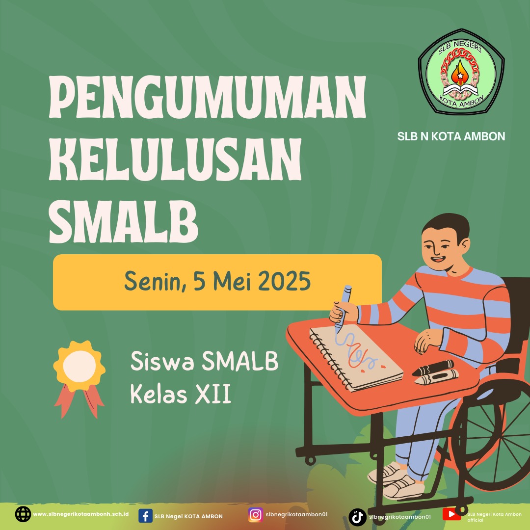 Ambon – SLB Negeri Kota Ambon mengumumkan bahwa hasil kelulusan siswa SMALB Kelas XII Tahun Ajaran 2024/2025 akan diinformasikan secara resmi pada hari Senin, 5 Mei 2025, pukul 15.00 WIT.