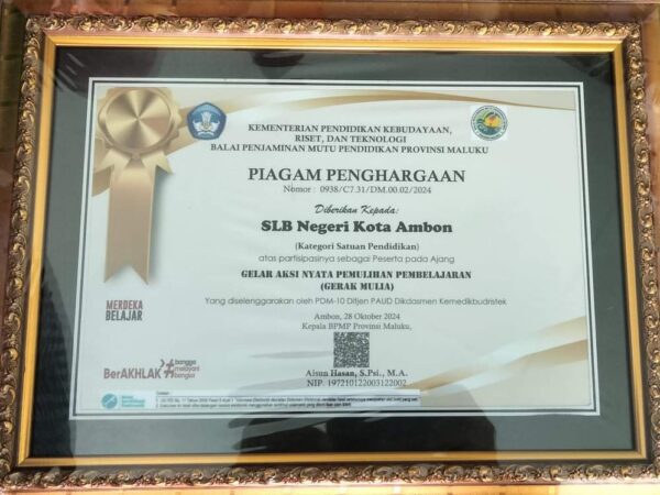 Penghargaan Dari BPMP Propinsi Maluku Kepada SLB Negeri Kota Ambon Dalam Praktik Baik Gerakan Pemuliihan Pembelajaran (Gerak Mulia)